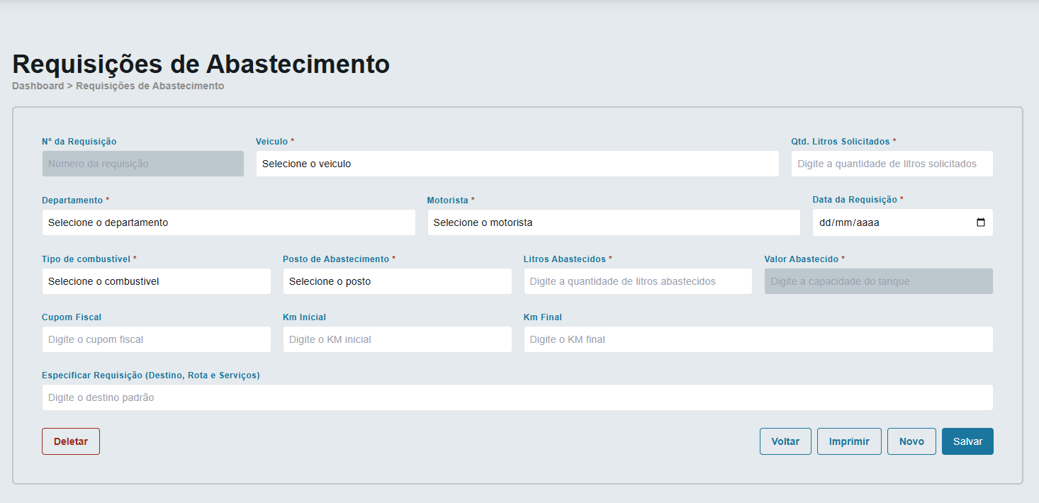 Controle total sobre as requisições, com registro de veículo, motorista, quantidade de litros e valores.