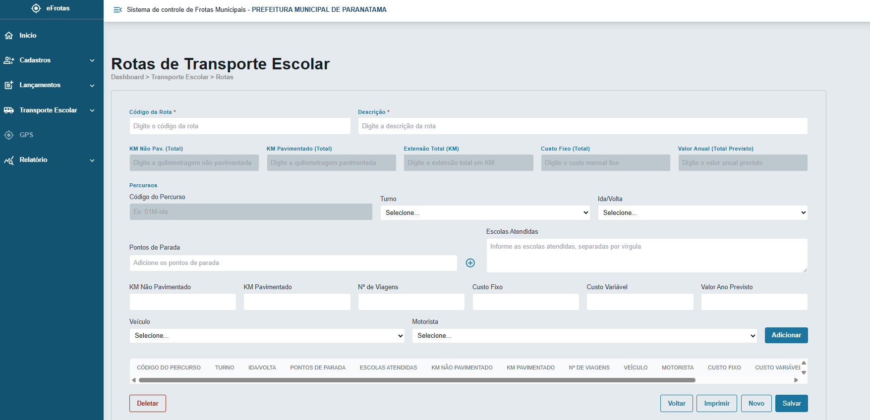Administre as rotas de transporte escolar com informações detalhadas sobre percursos, quilometragem e custos.