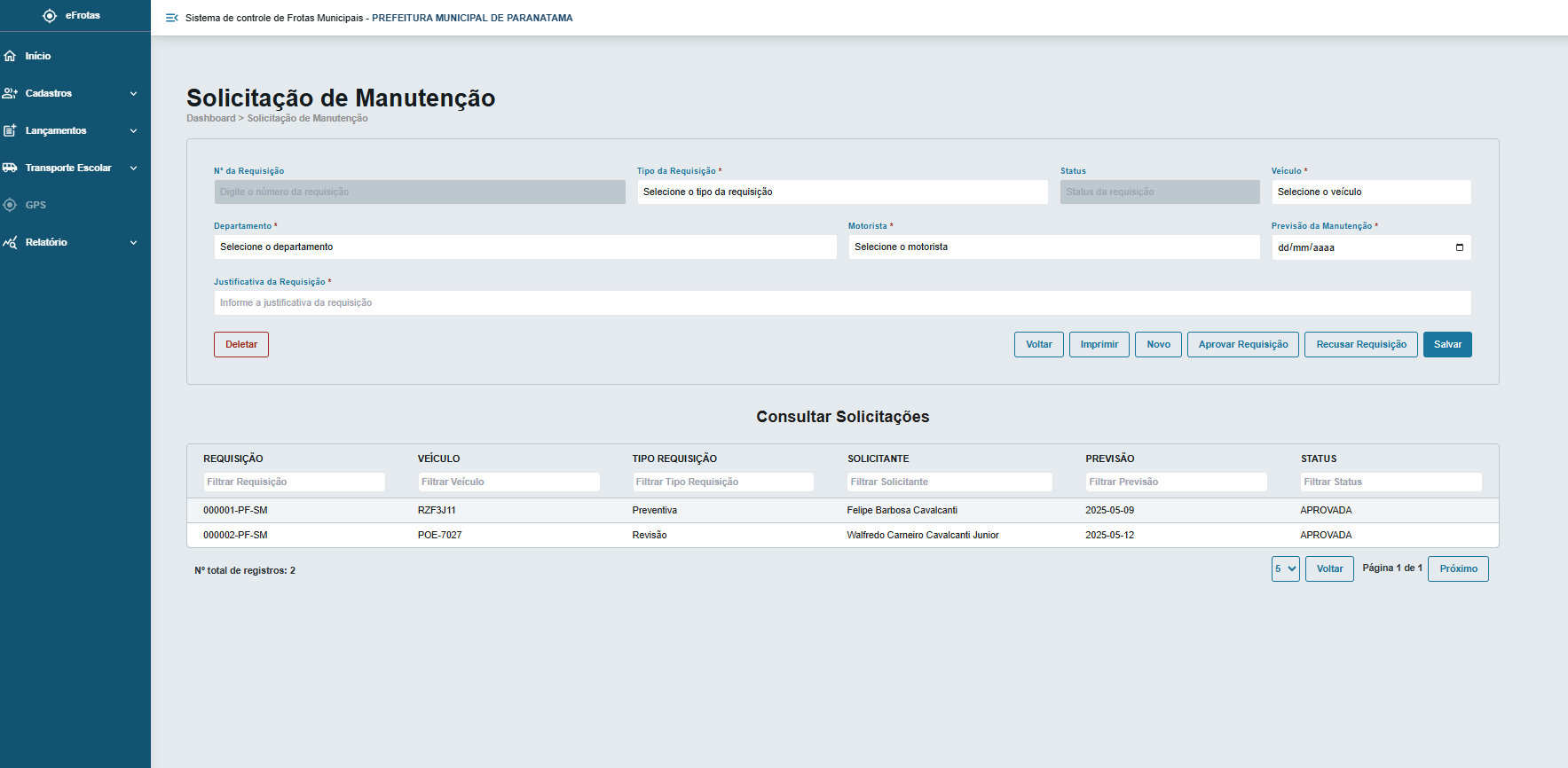 Gerencie as solicitações de manutenção, acompanhando o status, o veículo e o motorista responsável.