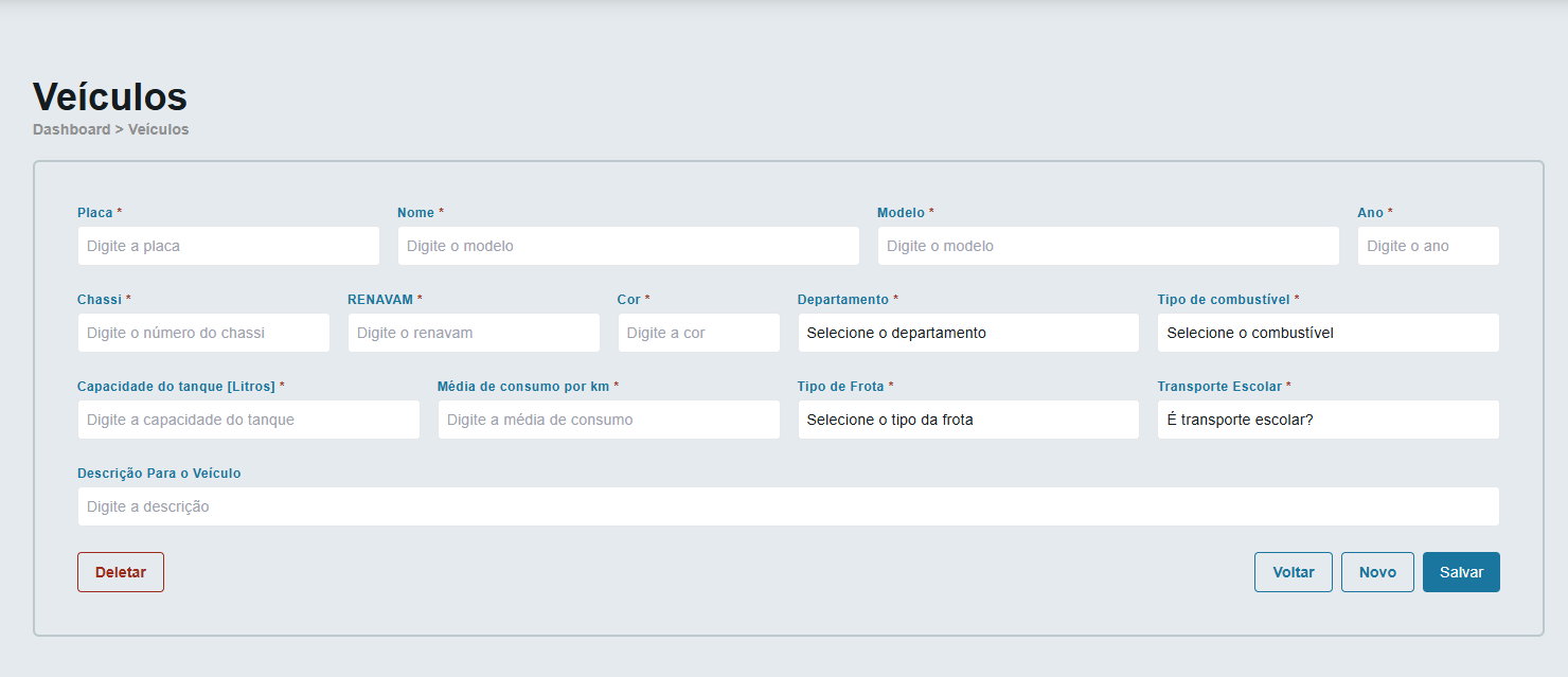 Gerencie todos os detalhes da sua frota, desde informações básicas até dados de consumo e tipo de frota.